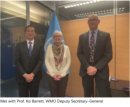 While in Geneva, Dr. Duan met with Prof. Ko Barrett, WMO Deputy Secretary-General, who commended the Typhoon Committee’s achievements in disaster risk reduction across the Asia-Pacific region. She reaffirmed WMO’s commitment to further strengthening support for the Committee’s activities. The meeting was also joined by Mr. Cyrille Honoré, WMO Director for Services, and Mr. Ben Churchill, Director of the WMO Regional Office for Asia (RA II).